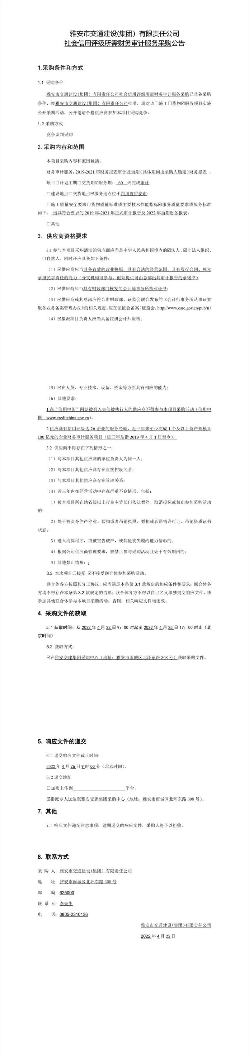 雅安市交通建设(集团)有限责任公司社会信用评级所需财务审计服务采购公告