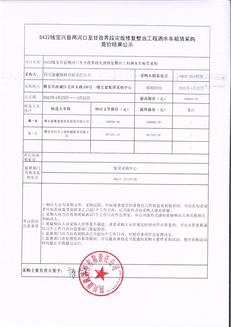 四川康藏路桥有限责任公司S432线宝兴县两河口至甘孜界段灾毁修复整治工程洒水车租赁采购竞价结果公示