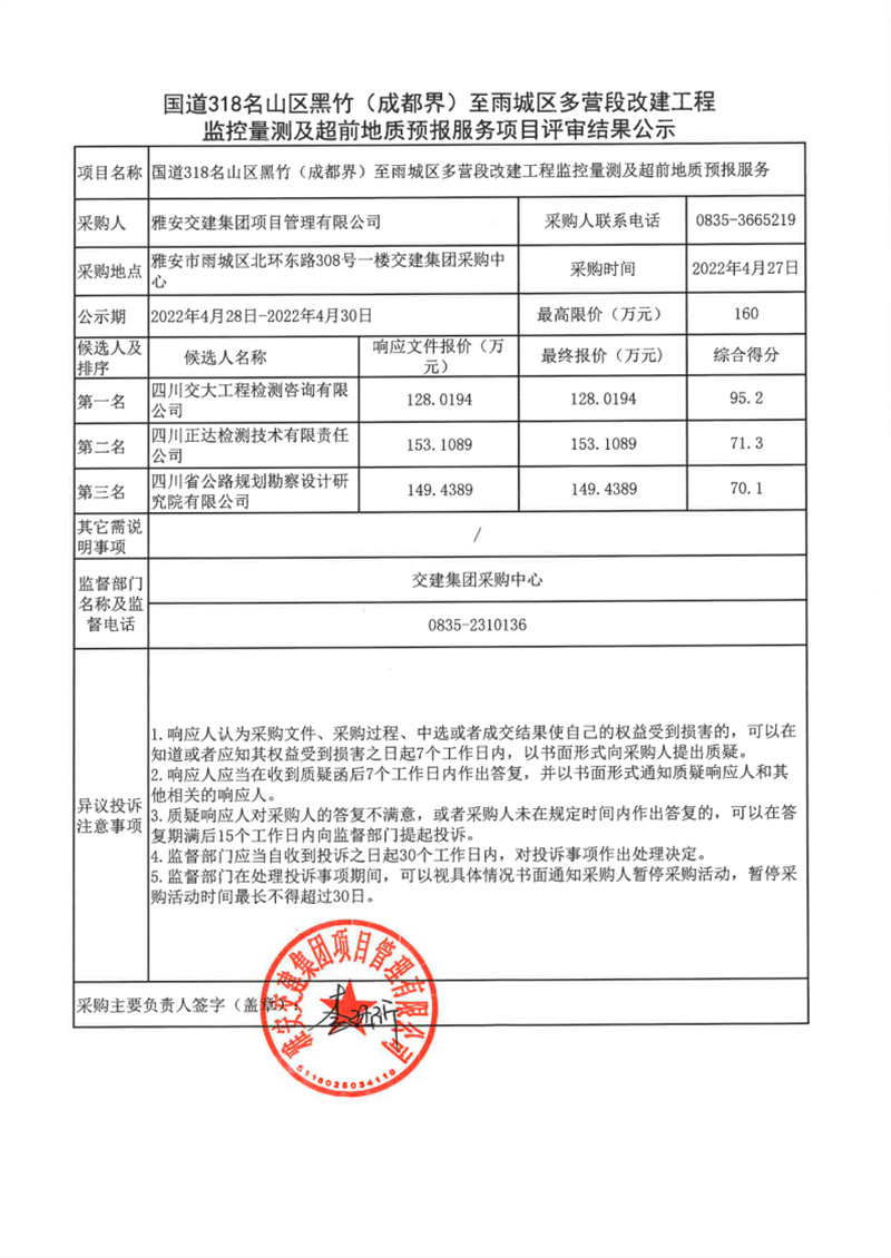 亿万先生MR集团项目管理有限公司国道318名山区黑竹(成都界)至雨城区多营段改建工程监控量测及超前地质预报服务项目评审结果公示