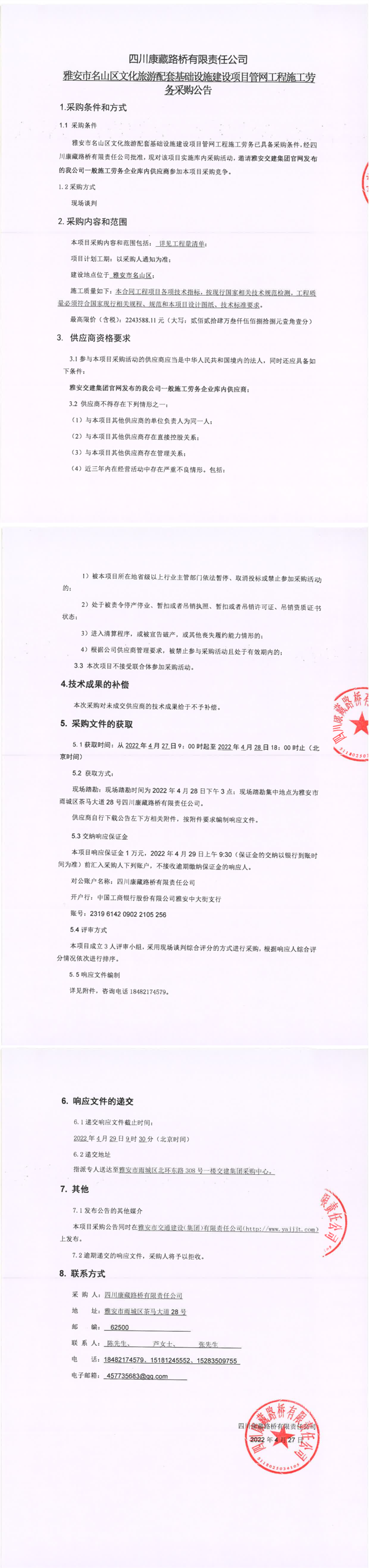 四川康藏路桥有限责任公司雅安市名山区文化旅游配套基础设施建设项目管网工程施工劳务采购公告