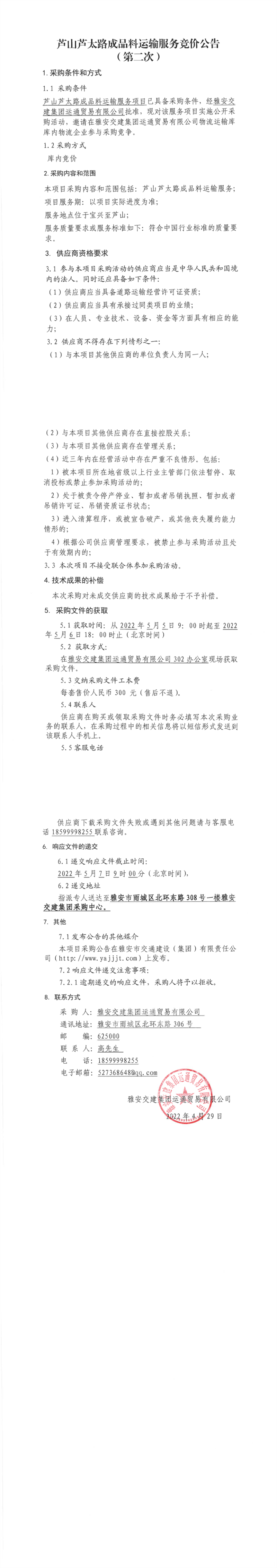 亿万先生MR集团运通贸易有限公司芦山芦太路成品料运输服务竞价公告(第二次)