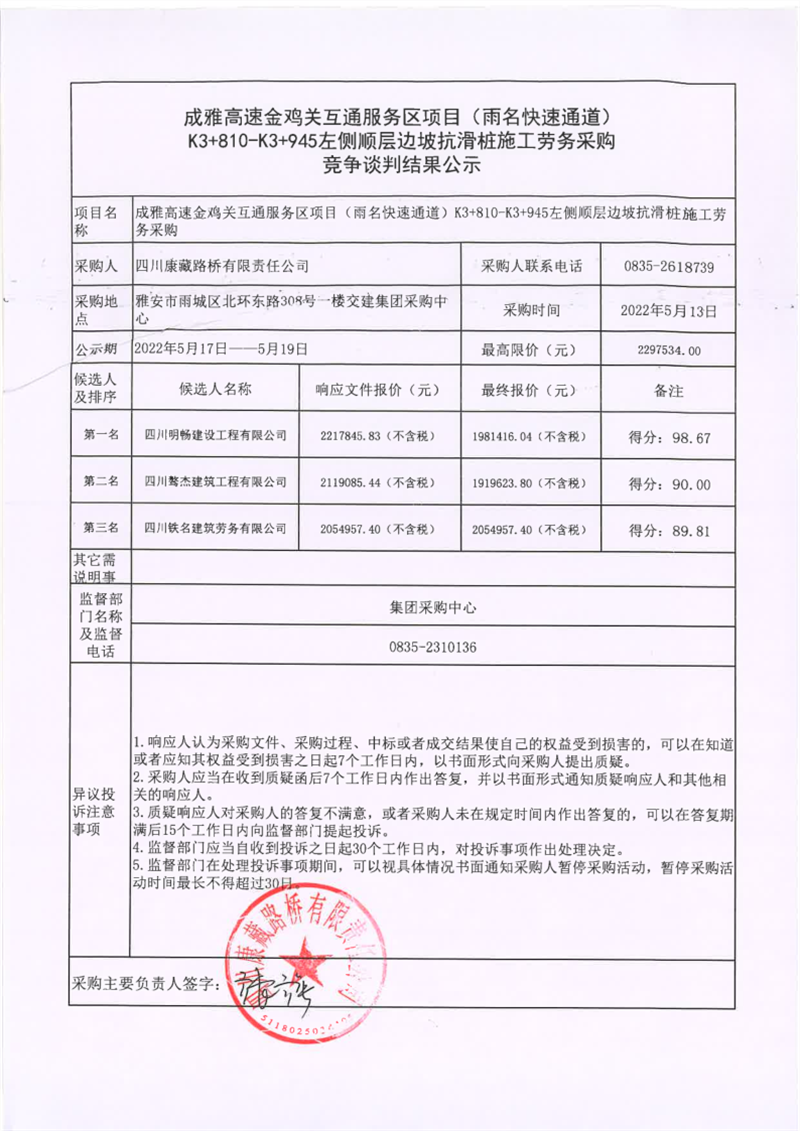 四川康藏路桥有限责任公司成雅高速金鸡关互通服务区项目(雨名快速通道)K3+810-K3+945左侧顺层边坡抗滑桩施工劳务采购竞争谈判结果公示