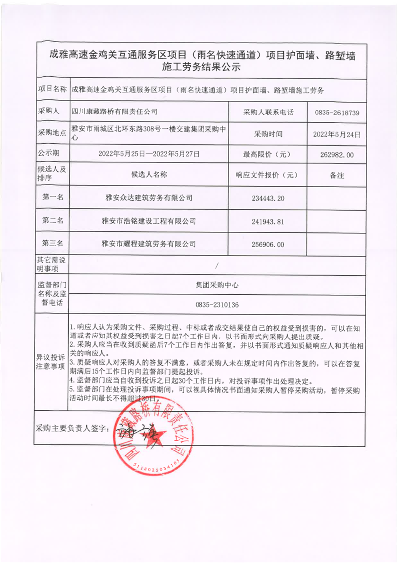 四川康藏路桥有限责任公司成雅高速金鸡关互通及服务区项目(雨名快速通道)项目护面墙、路堑墙施工劳务结果公示