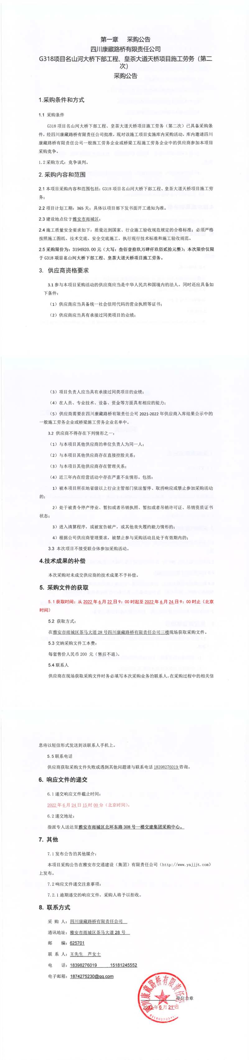 四川康藏路桥有限责任公司G318项目名山河大桥下部工程、皇茶大道天桥项目施工劳务(第二次)采购公告