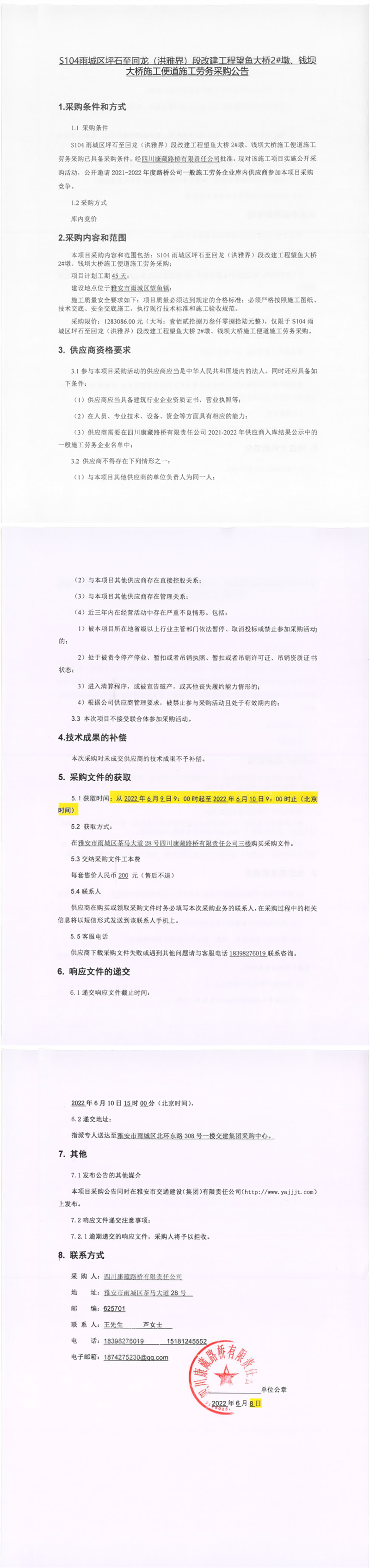 四川康藏路桥有限责任公司S104雨城区坪石至回龙(洪雅界)段改建工程望鱼大桥2#墩、钱坝大桥施工便道施工劳务采购公告