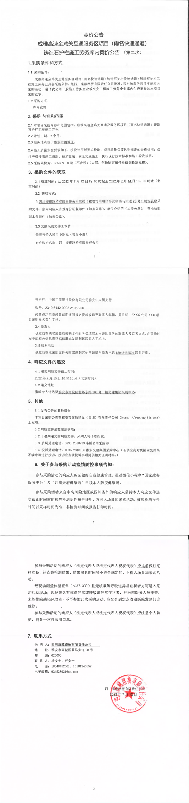 四川康藏路桥有限责任公司成雅高速金鸡关互通服务区项目(雨名快速通道)铸造石护栏施工劳务库内竞价公告(第二次)