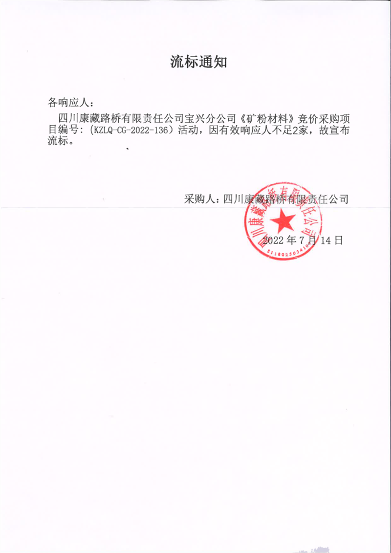 四川康藏路桥有限责任公司宝兴分公司矿粉材料采购流标通知