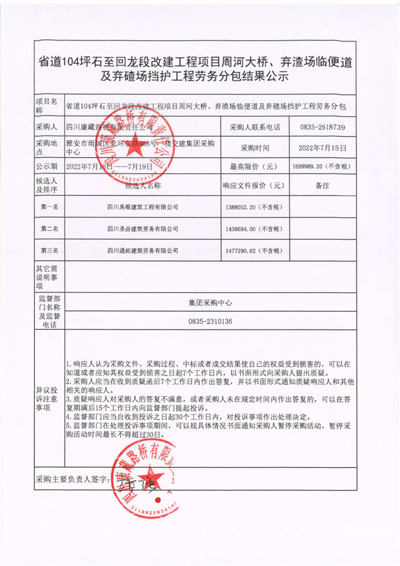 四川康藏路桥有限责任公司省道104坪石至回龙段改建工程项目周河大桥、弃渣场临便道及弃碴场挡护工程劳务分包结果公示