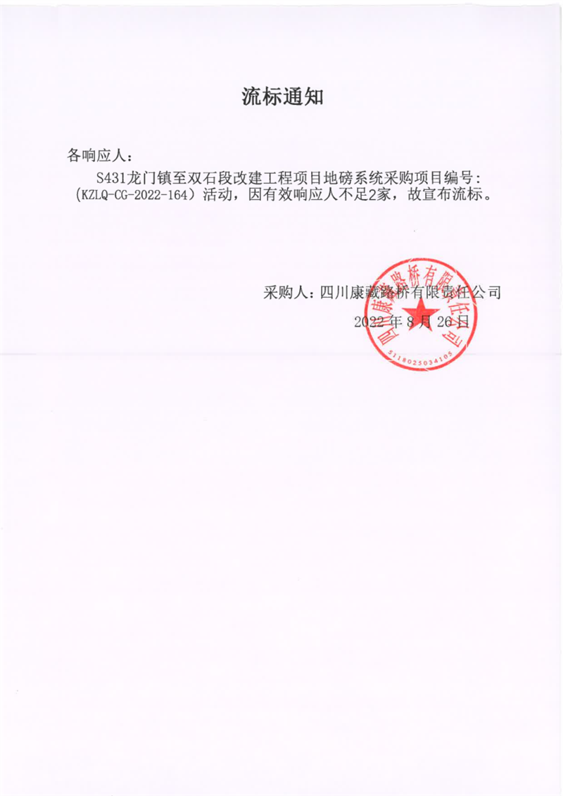 四川康藏路桥有限责任公司S431龙门镇至双石段改建工程项目地磅系统采购项目流标通知