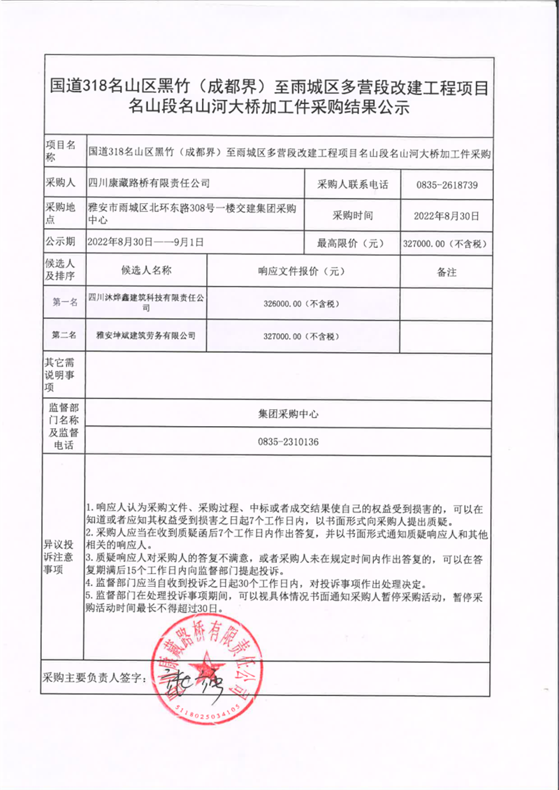 四川康藏路桥有限责任公司国道318名山区黑竹(成都界)至雨城区多营段改建工程项目名山段名山河大桥加工件采购结果公示