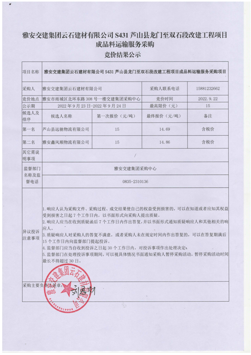 亿万先生MR集团云石建材有限公司S431芦山县龙门至双石段改建工程项目成品料运输服务采购竞价结果公示