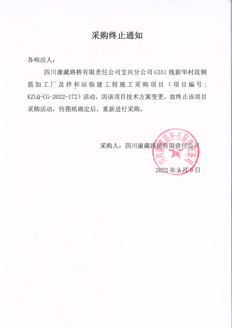 四川康藏路桥有限责任公司宝兴分公司G351线新华村段钢筋加工厂及拌合站临建工程施工采购项目采购终止通知