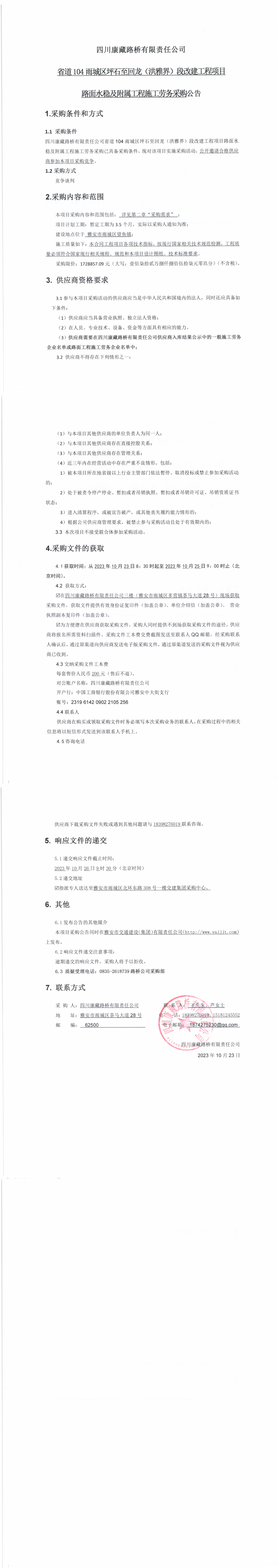 四川康藏路桥有限责任公司省道104雨城区坪石至回龙(洪雅界)段改建工程项目路面水稳及附属工程施工劳务采购公告