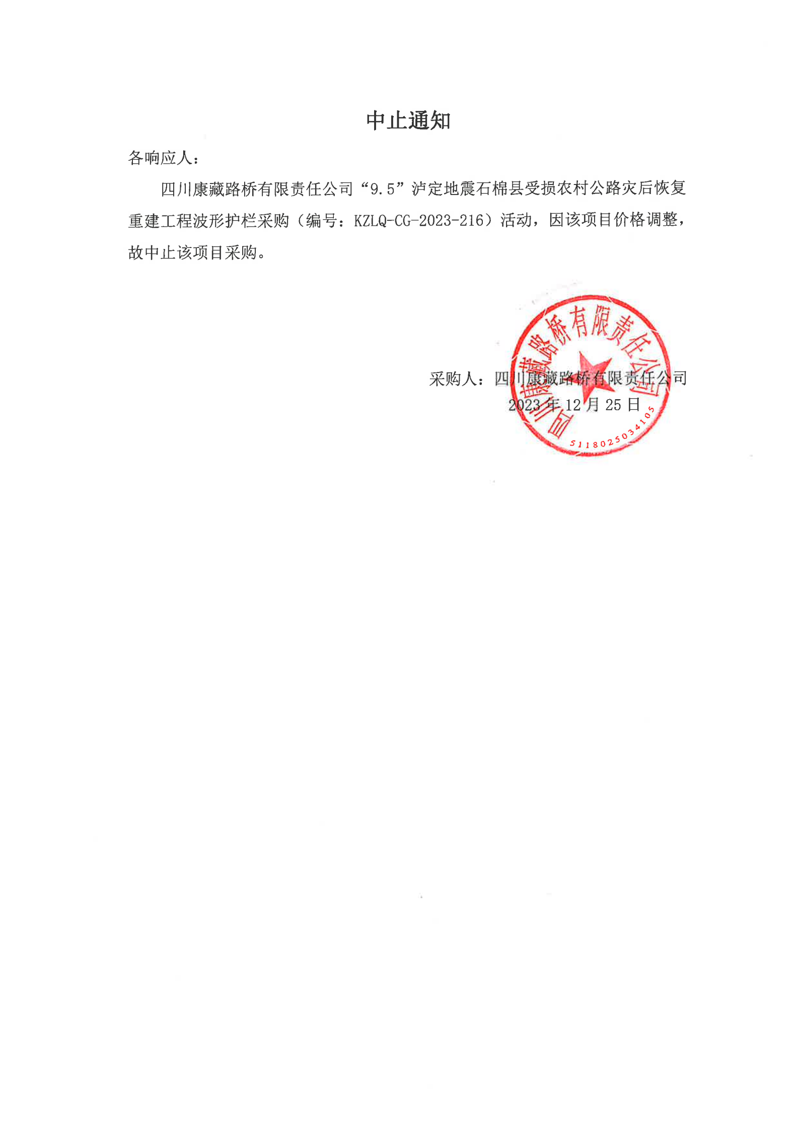 四川康藏路桥有限责任公司“9.5”泸定地震石棉县受损农村公路灾后恢复重建工程波形护栏采购中止通知