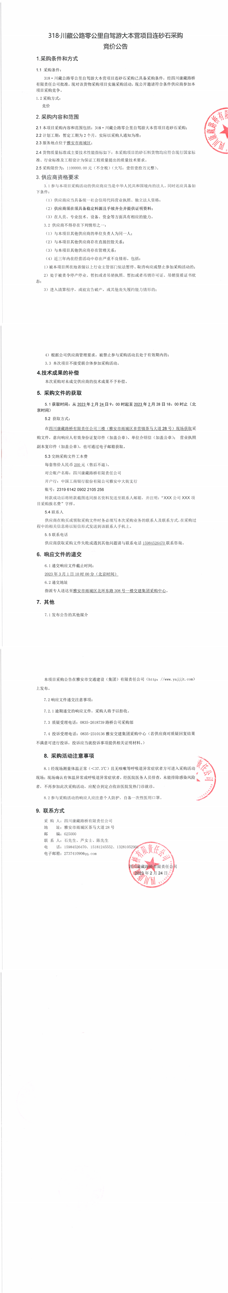 四川康藏路桥有限责任公司318·川藏公路零公里自驾游大本营项目连砂石采购竞价公告