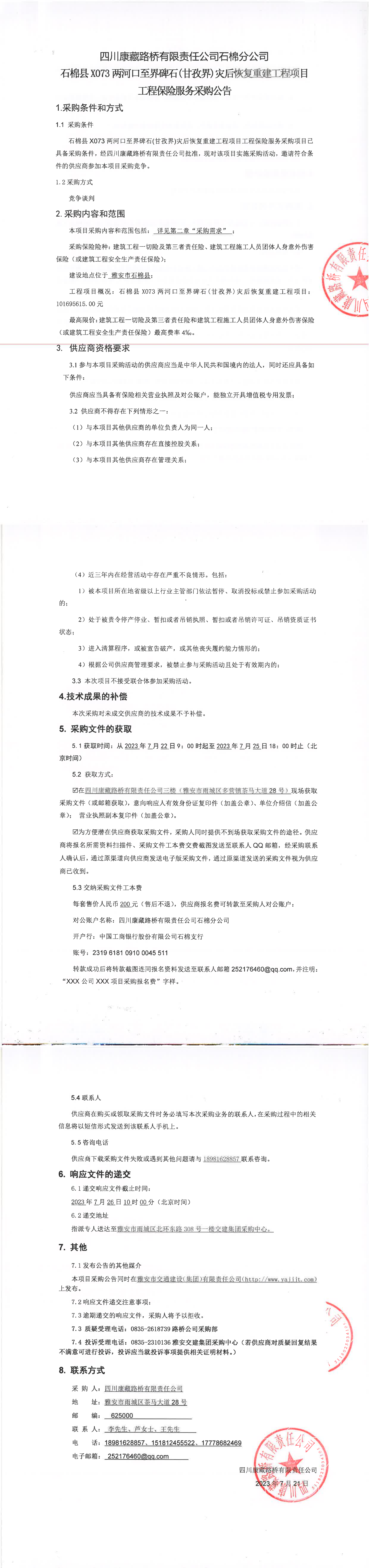 四川康藏路桥有限责任公司石棉县X073两河口至界碑石(甘孜界)灾后恢复重建工程项目工程保险服务采购公告