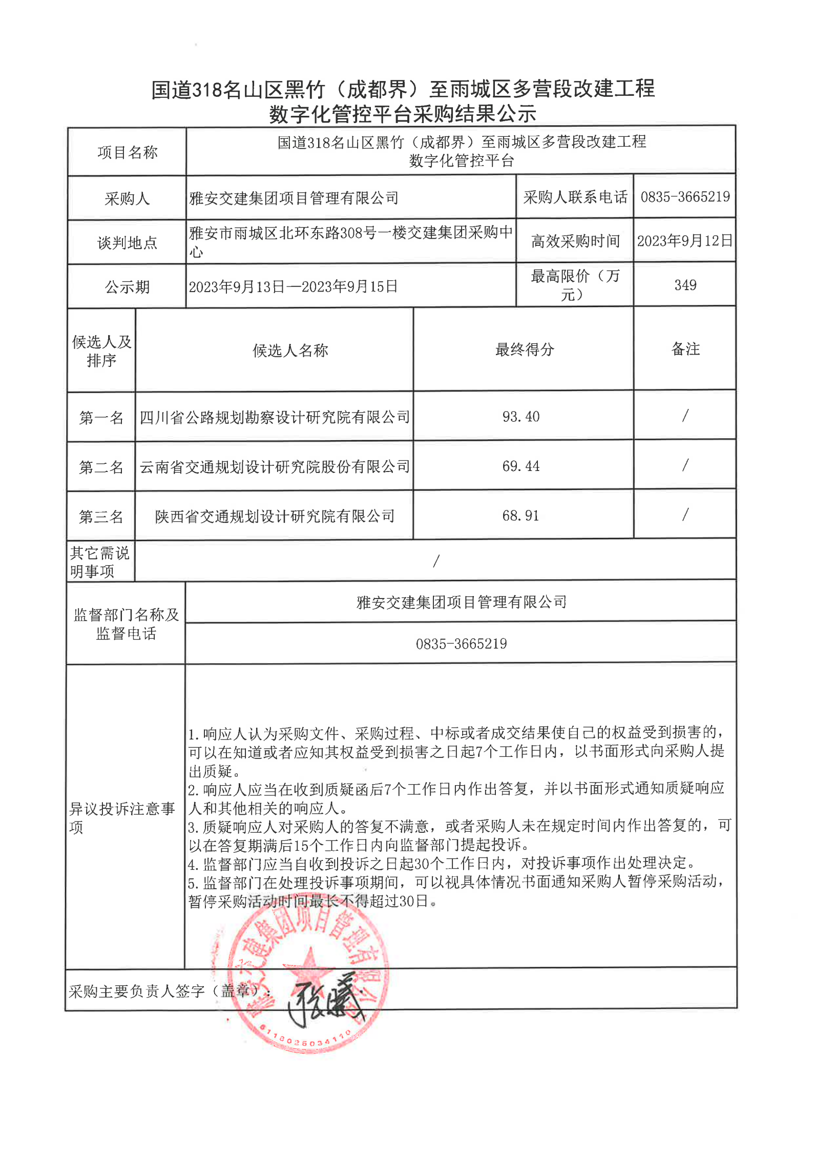 亿万先生MR集团项目管理有限公司国道318名山区黑竹(成都界)至雨城区多营段改建工程数字化管控平台采购结果公示