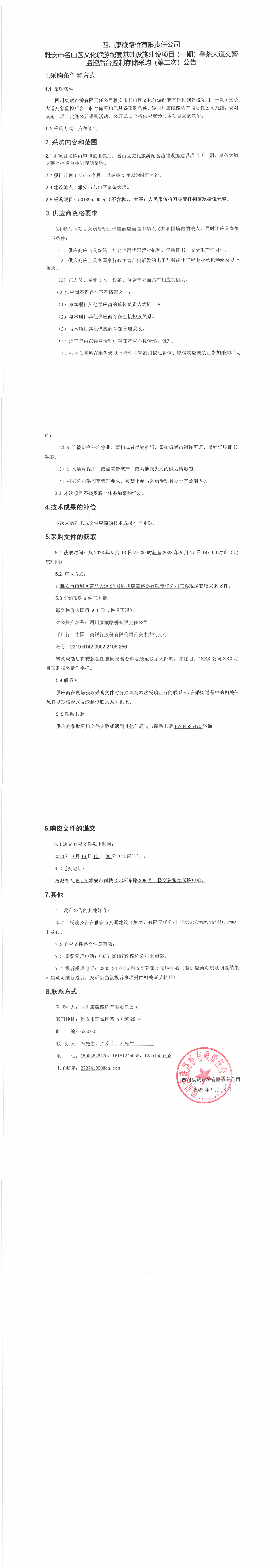 四川康藏路桥有限责任公司雅安市名山区文化旅游配套基础设施建设项目(一期)皇茶大道交警监控后台控制存储采购(第二次)公告