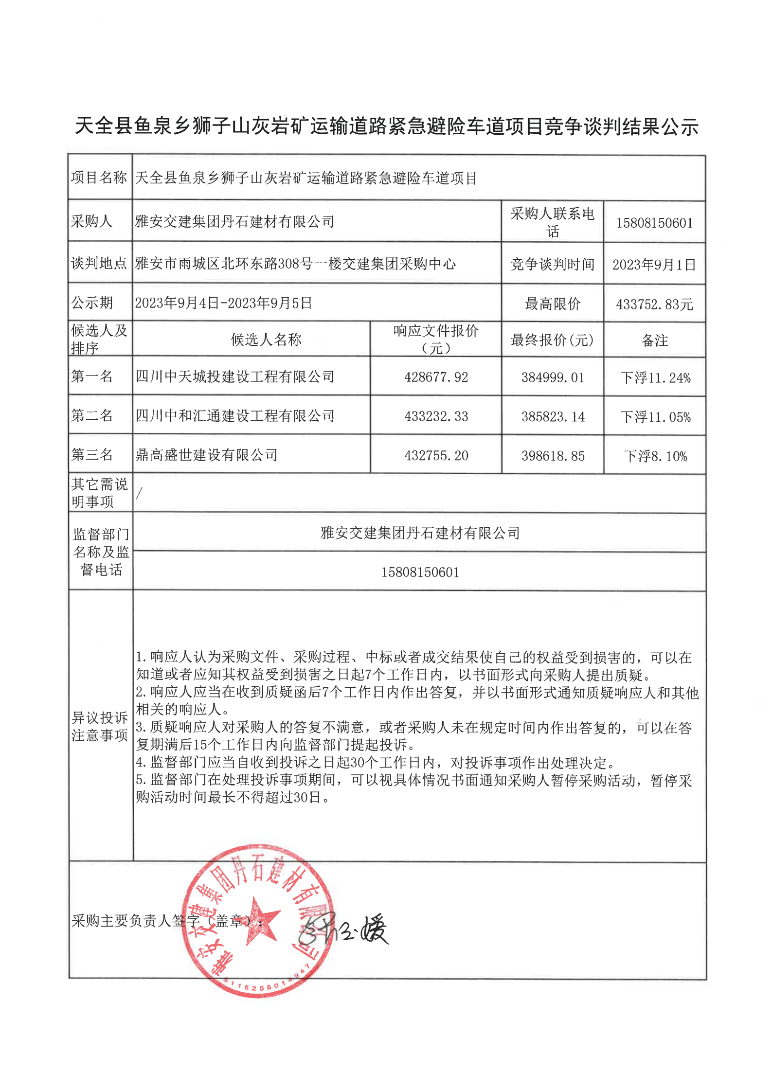 亿万先生MR集团丹石建材有限公司天全县鱼泉乡狮子山灰岩矿运输道路紧急避险车道项目竞争谈判结果公示