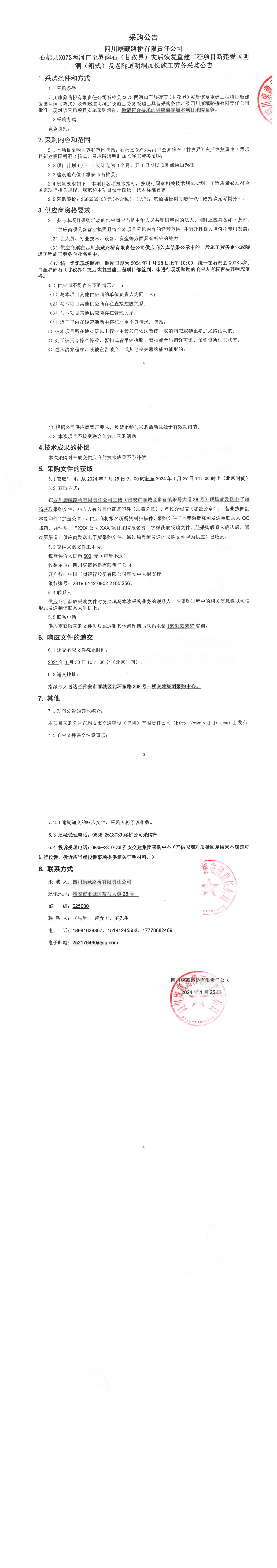 四川康藏路桥有限责任公司石棉县X73两河口至界碑石(甘孜界)灾后恢复重建工程项目新建爱国明洞(箱式)及老隧道明洞加长施工劳务采购公告