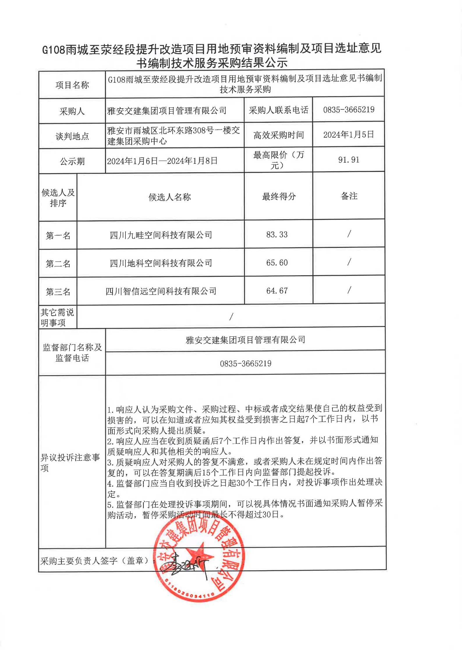 亿万先生MR集团项目管理有限公司G108雨城至荥经段提升改造项目用地预审资料编制及项目选址意见书编制技术服务采购结果公示