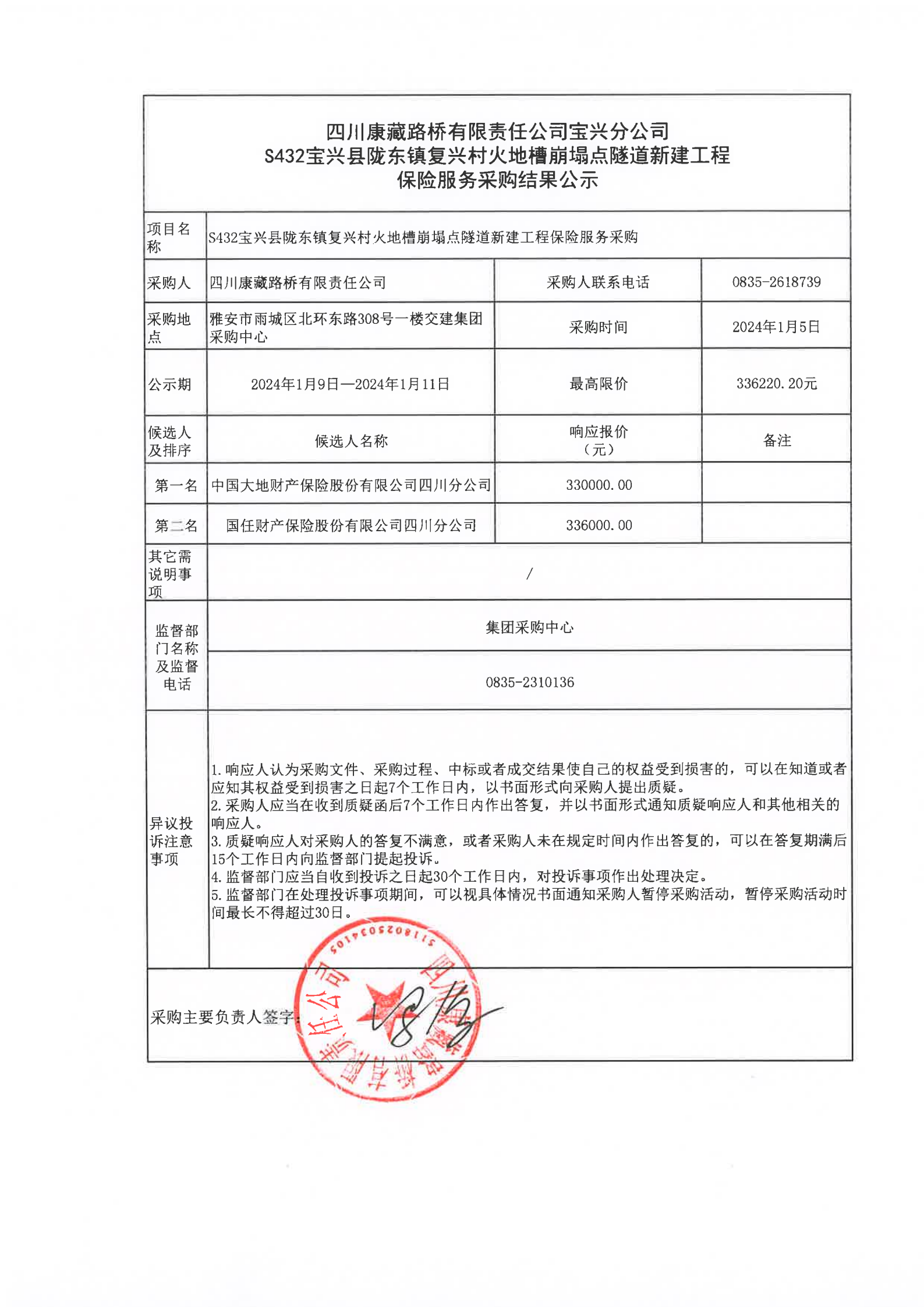 四川康藏路桥有限责任公司S432宝兴县陇东镇复兴村火地槽崩塌点隧道新建工程保险服务采购结果公示