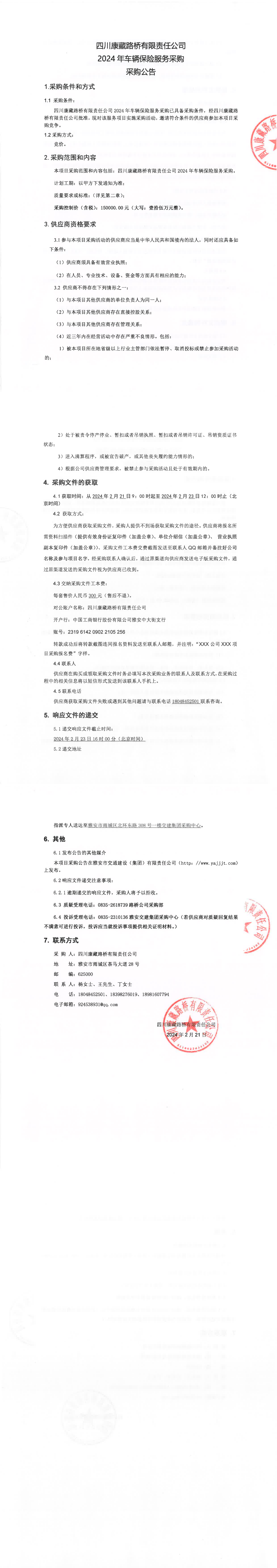 四川康藏路桥有限责任公司2024年车辆保险服务采购公告