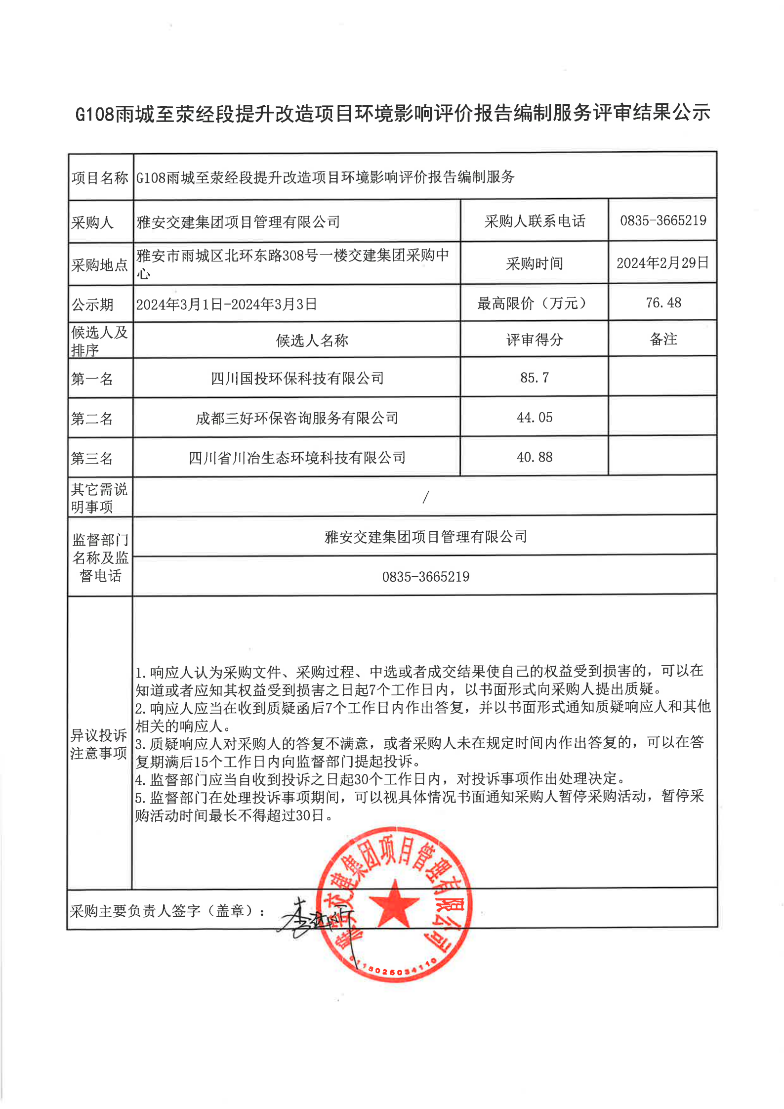 亿万先生MR集团项目管理有限公司G108雨城至荥经段提升改造项目环境影响评价报告编制服务评审结果公示
