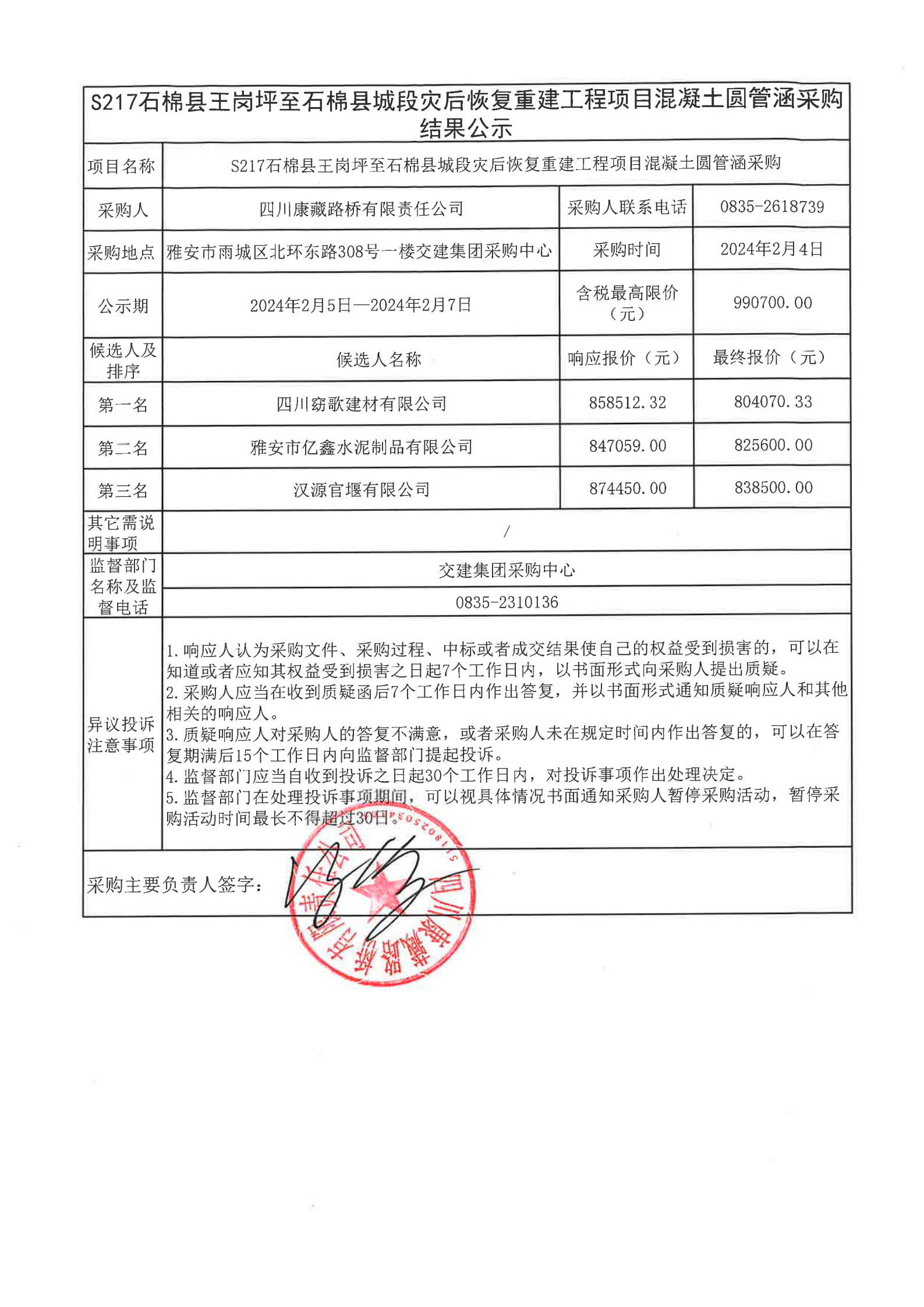 四川康藏路桥有限责任公司S217石棉县王岗坪至石棉县城段灾后恢复重建工程项目混凝土圆管涵采购结果公示