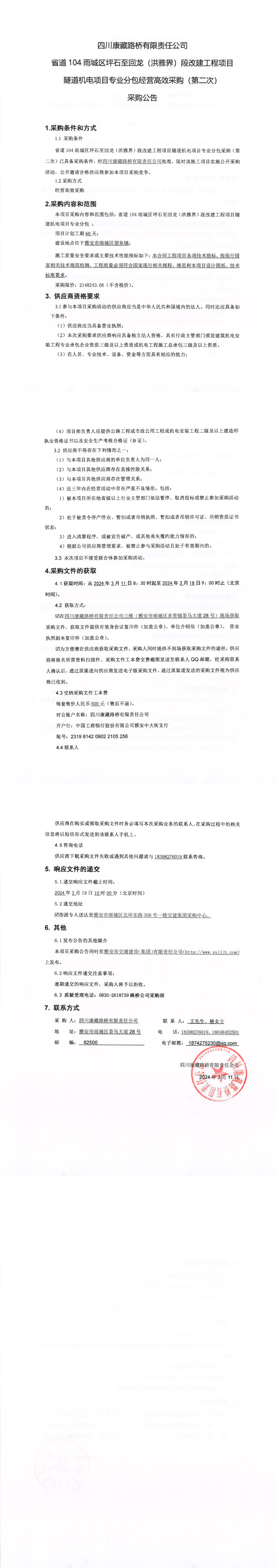 四川康藏路桥有限责任公司省道104雨城区坪石至回龙(洪雅界)段改建工程项目隧道机电项目专业分包经营高效采购(第二次)采购公告