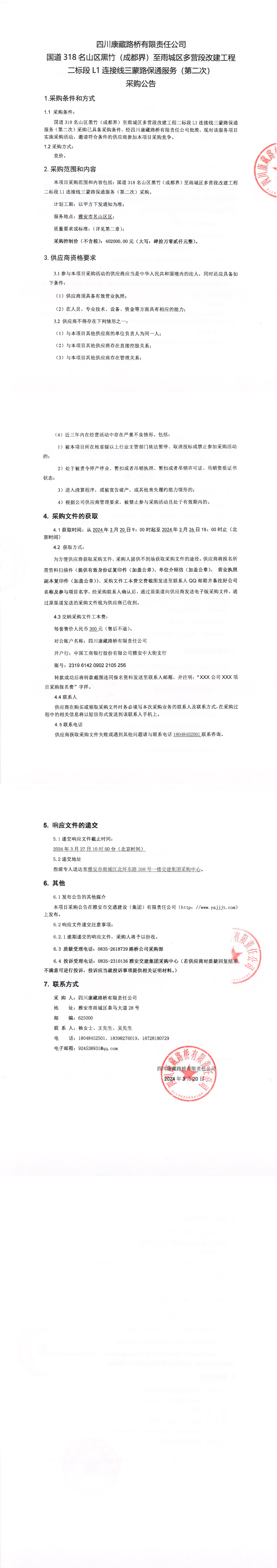 四川康藏路桥有限责任公司国道318名山区黑竹(成都界)至雨城区多营段改建工程二标段L1连接线三蒙路保通服务(第二次)采购公告