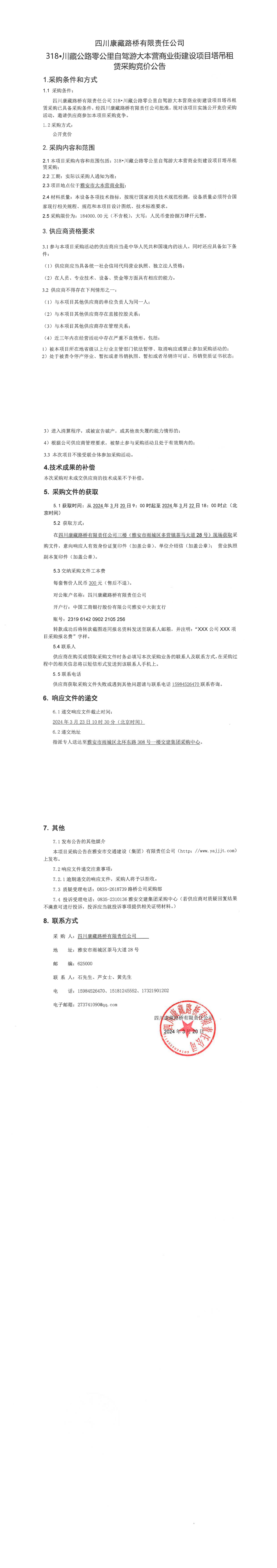 四川康藏路桥有限责任公司318·川藏公路零公里自驾游大本营商业街建设项目塔吊租赁采购竞价公告