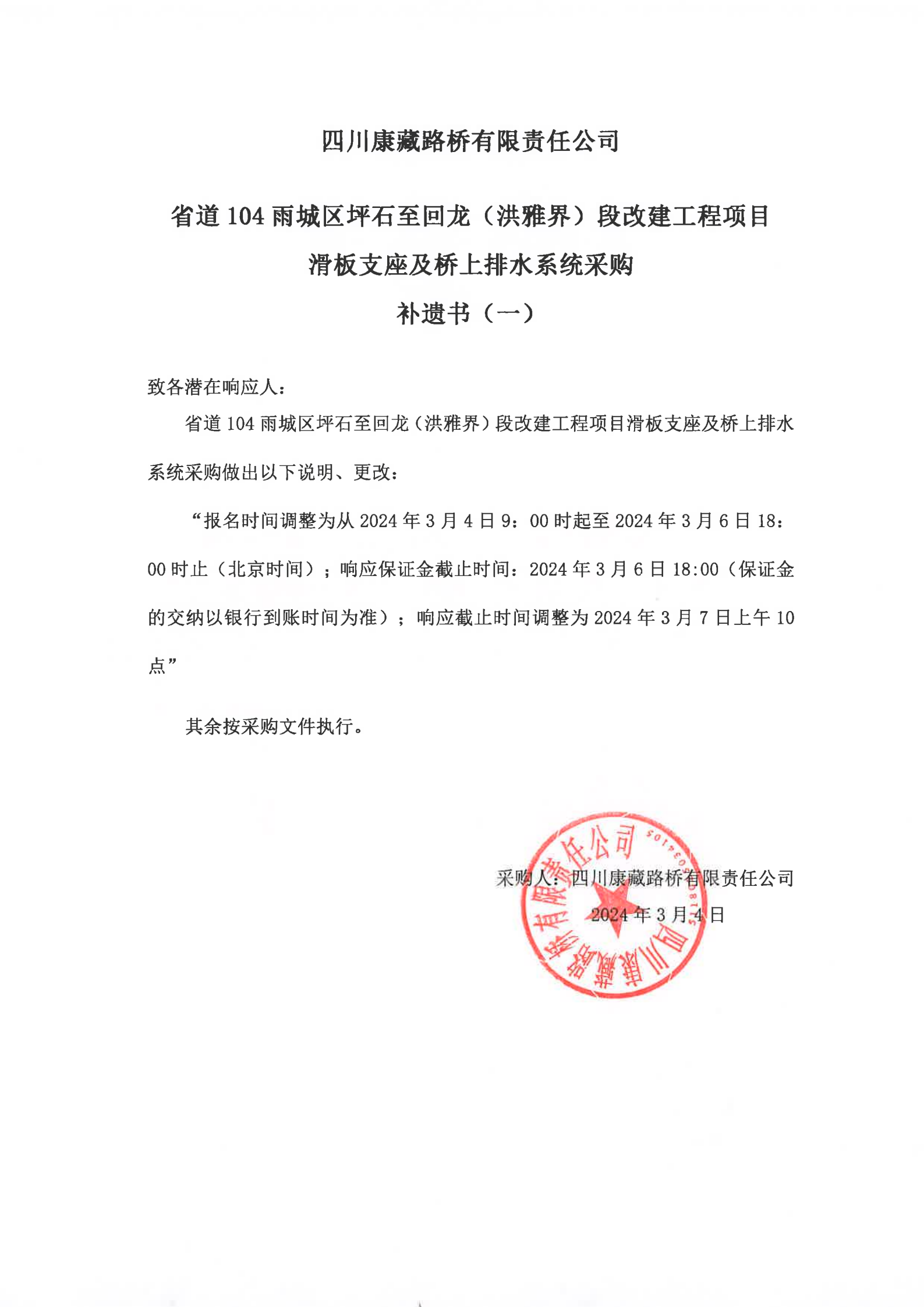 四川康藏路桥有限责任公司省道104雨城区坪石至回龙(洪雅界)段改建工程项目滑板支座及桥上排水系统采购补遗书(一)