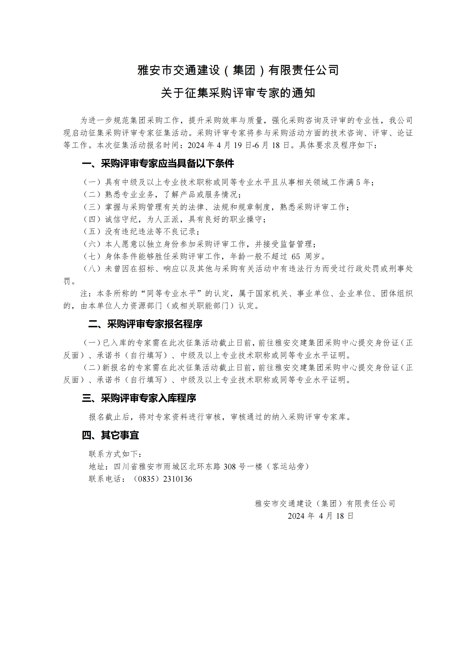 雅安市交通建设(集团)有限责任公司关于征集采购评审专家的通知