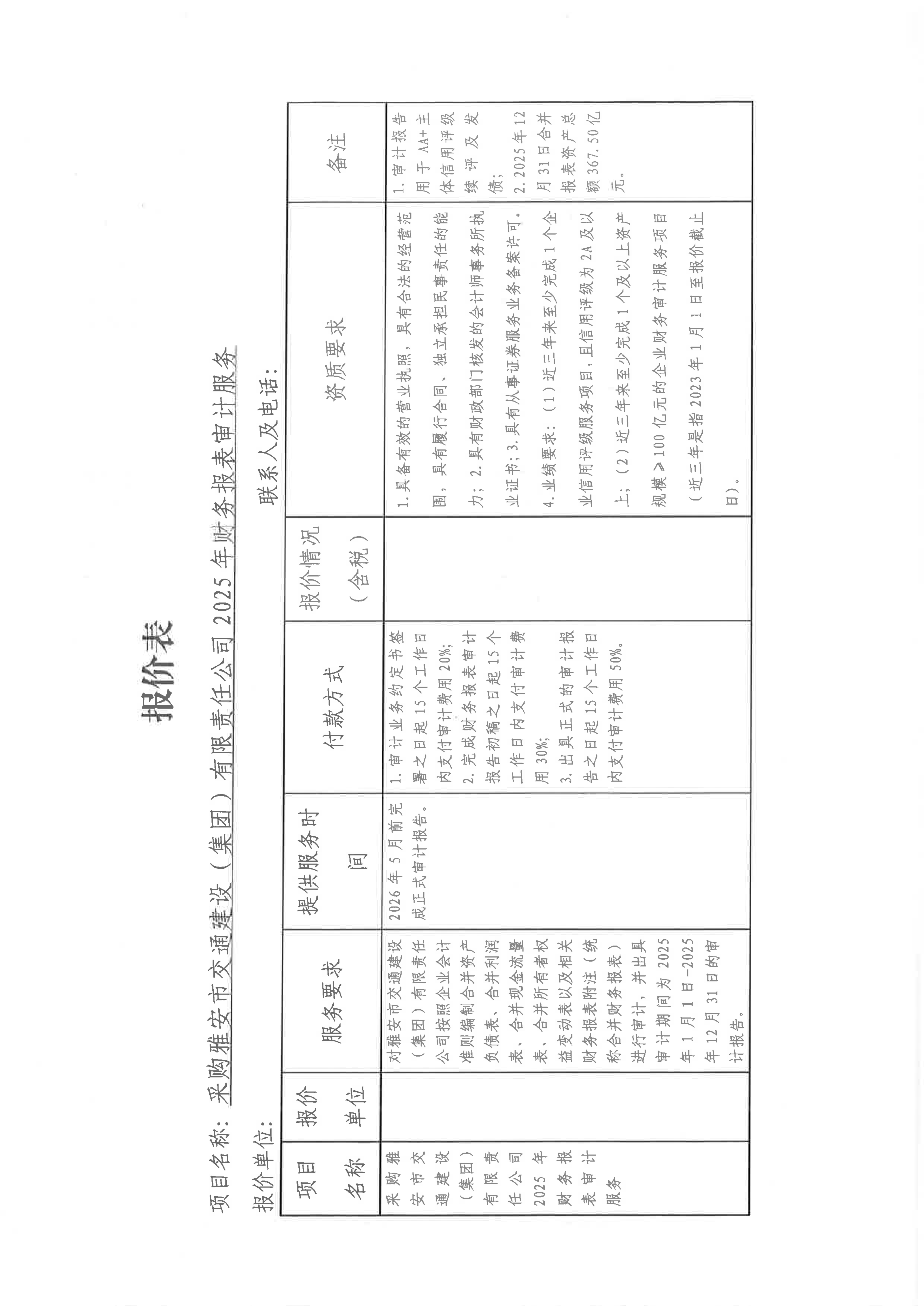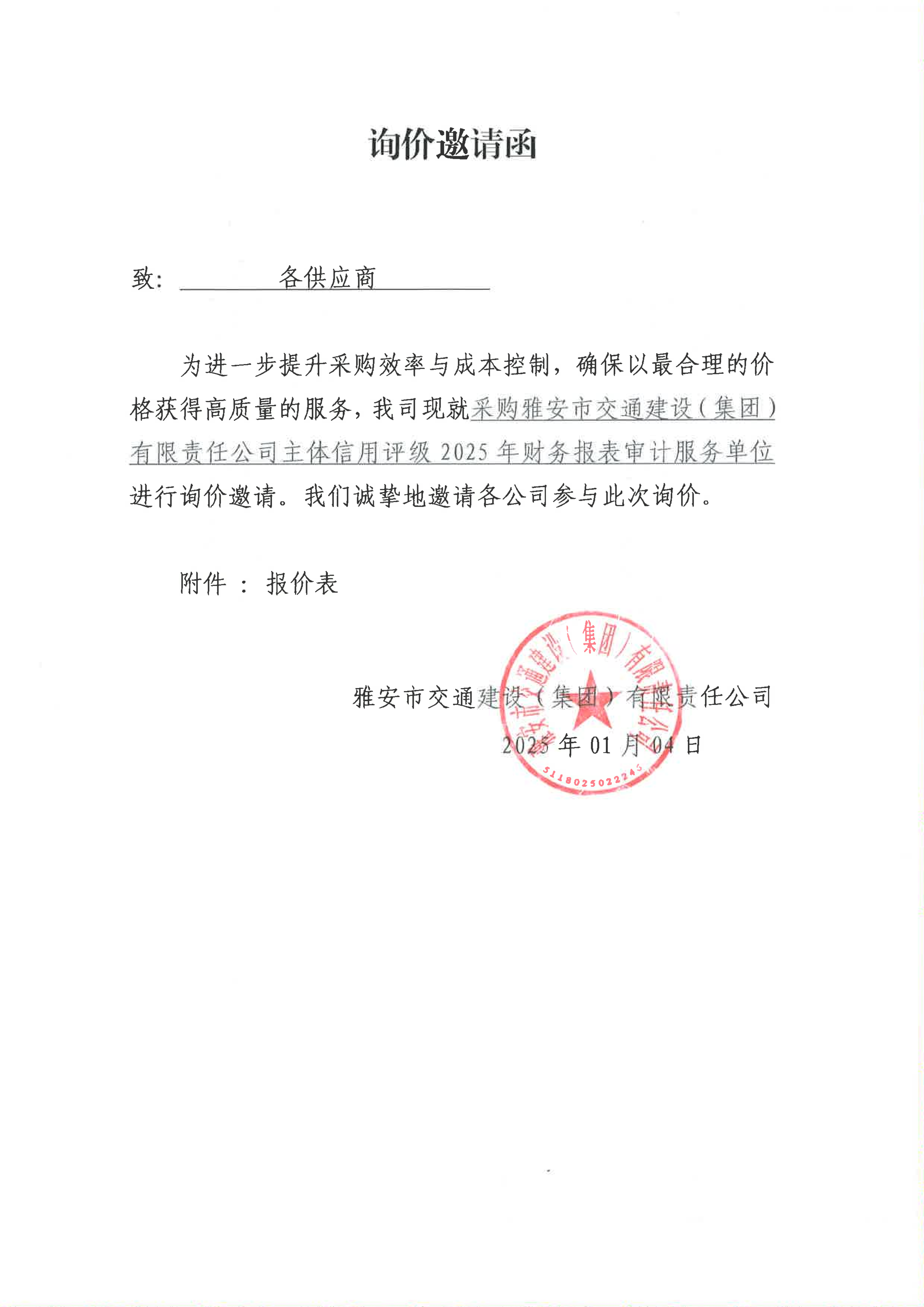 关于采购雅安市交通建设(集团)有限责任公司主体信用评级2025年财务报表审计服务限价的询价函