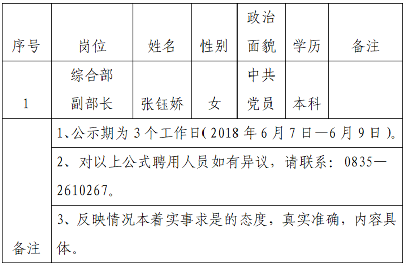 根据雅安市交通建设(集团)有限责任公司人才选聘实施办法(试行)第十四条的规定:党政机关事业单位人员选拔程序,以组织选拔方式进行,主要是沟通推荐、组织考察、会议研究、任前公示、研究聘用。亿万先生MR集团平顺检测有限公司研究确定以下1名拟聘用人员,现公示名单如下: