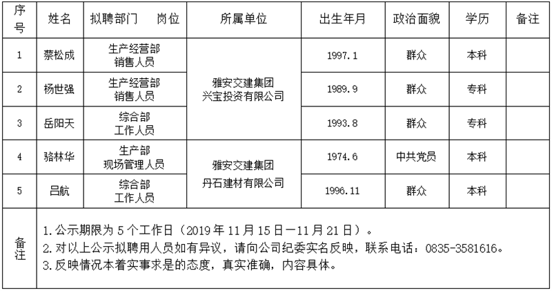 亿万先生MR集团所属子公司拟聘用人员公示(兴宝公司、丹石公司)