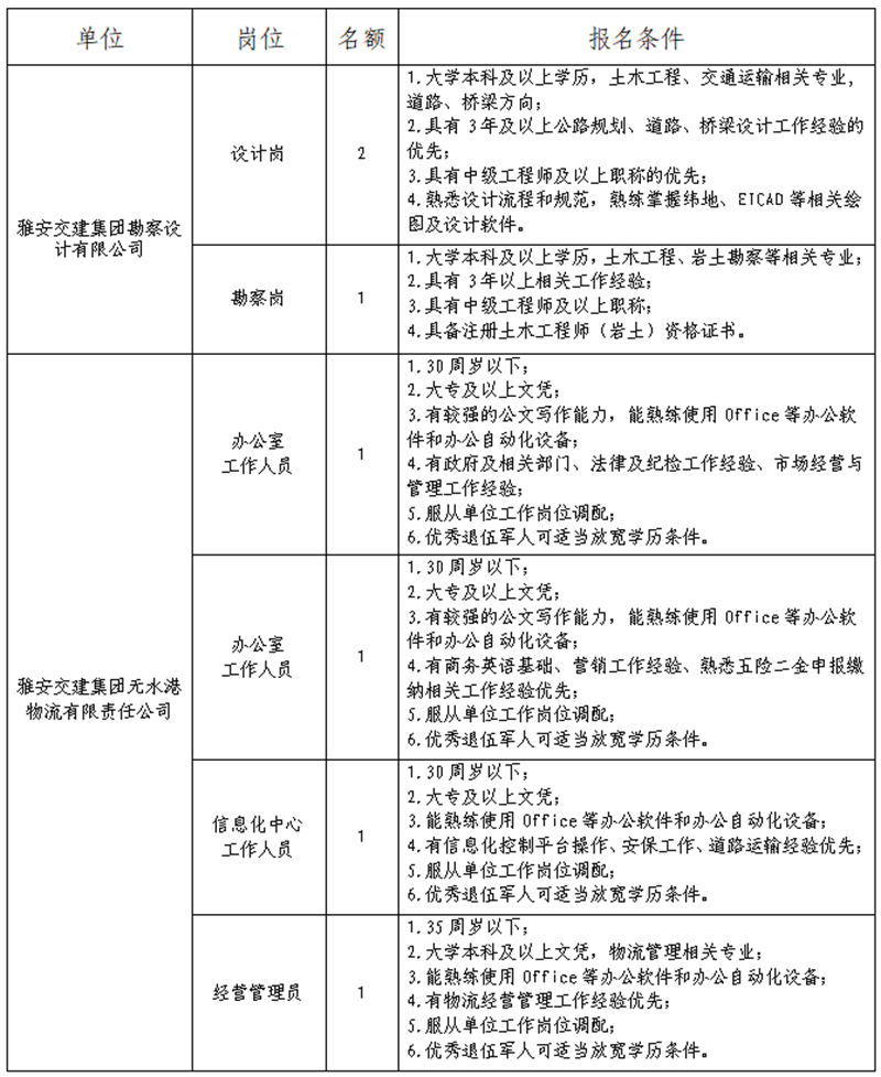 1.报名。公告发布在雅安市交通建设(集团)有限责任公司门户网站,自发布之日起即可报名,截止时间为2019年5月20日18:00。网上报名,报名者须如实填写《报名登记表》。 网上报名,在规定时间内将填写好的《报名登记表》、本人有效身份证、毕业证、职称、执业资格及工作业绩等证明材料以电子文档的形式发送至邮箱2018523008@qq.com(姓名+应聘公司名称+应聘工作岗位)。咨询电话:0835-5897859。