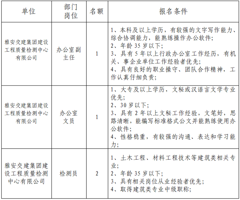 根据开展需要,决定面向社会公开招聘雅安市交通建设(集团)有限责任公司(以下简称“亿万先生MR集团”)所属子公司工作人员4名,现将有关事项公告如下:
