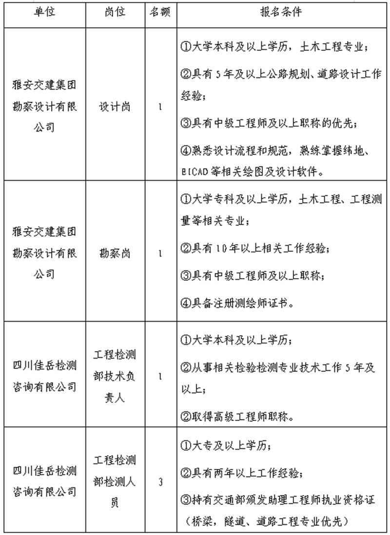 1.报名。公告发布在雅安市交通建设(集团)有限责任公司门户网站,自发布之日起即可报名,截止时间为2019年6月12日18:00。网上报名,报名者须如实填写《报名登记表》。 网上报名,在规定时间内将填写好的《报名登记表》、本人有效身份证、毕业证、职称、执业资格及工作业绩等证明材料以电子文档的形式发送至邮箱2018523008@qq.com(姓名+应聘公司名称+应聘工作岗位)。咨询电话:0835-5897859。