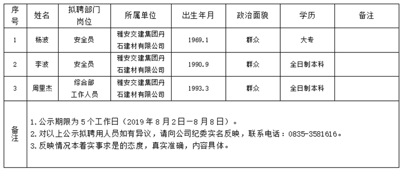 对以下拟聘用人员予以公示: