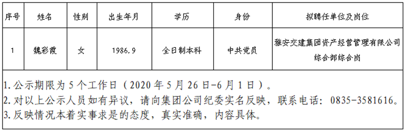 根据雅安市交通建设(集团)有限责任公司招聘公告,经公开报名、资格初审、笔试、面试、体检考察等环节,现将以下