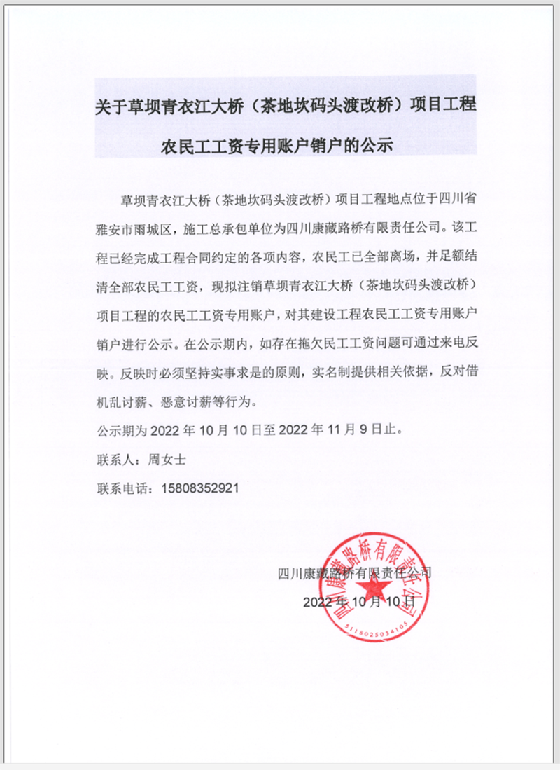 关于草坝青衣江大桥(茶地坎码头渡改桥)项目工程农民工工资专用账户销户的公告