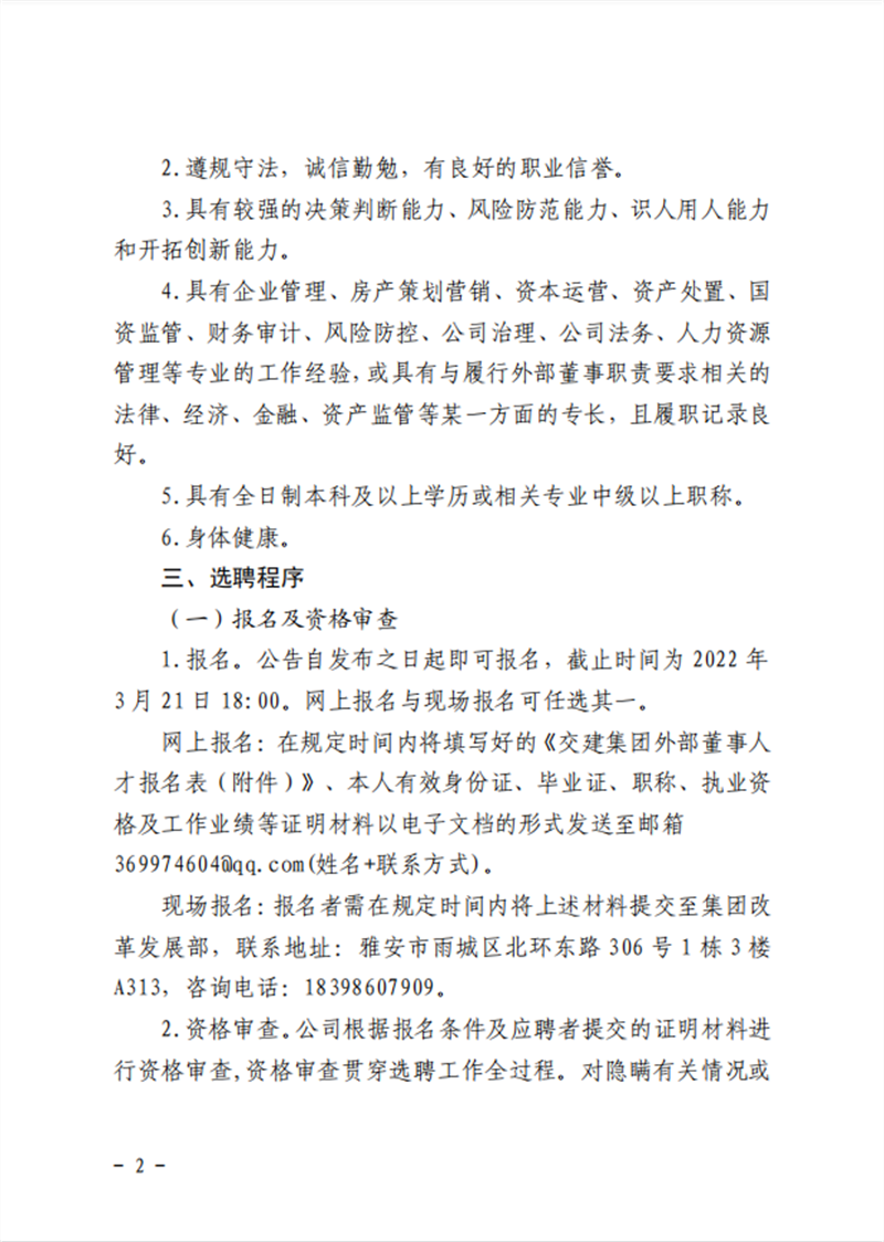 雅安交通建设(集团)有限责任公司 关于建立外部董事人才库的公告