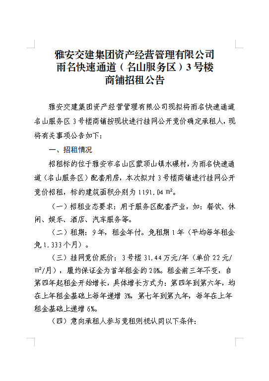 亿万先生MR集团资产经营管理有限公司 雨名快速通道(名山服务区)3号楼商铺招租公告