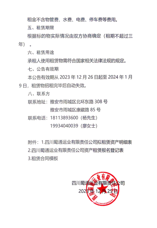 四川蜀通运业有限责任公司关于部分商铺、办公室对外招租的公告