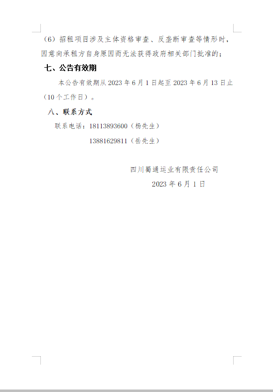 蜀通运业有限责任公司关于闲置资产公开招租的公告