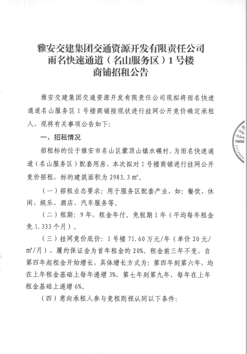 亿万先生MR集团交通资源开发有限责任公司雨名快速通道名山服务区1号楼招租公告附件