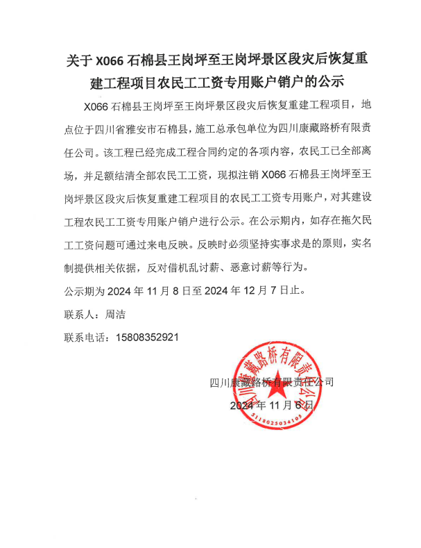 关于X066石棉县王岗坪至王岗坪景区段灾后恢复重建工程项目农民工工资专用账户销户的公示