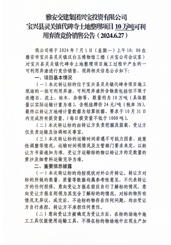 亿万先生MR集团兴宝投资有限公司宝兴县灵关镇代碑寺土地整理项目10万吨可利用弃渣竞价销售公告(2024.6.27)